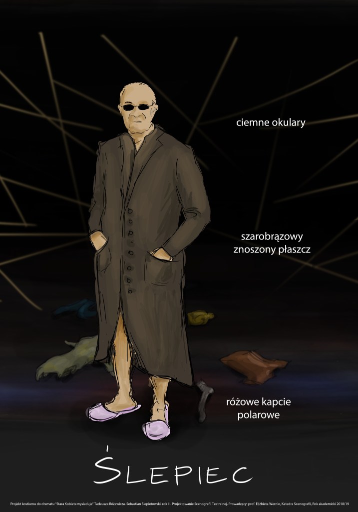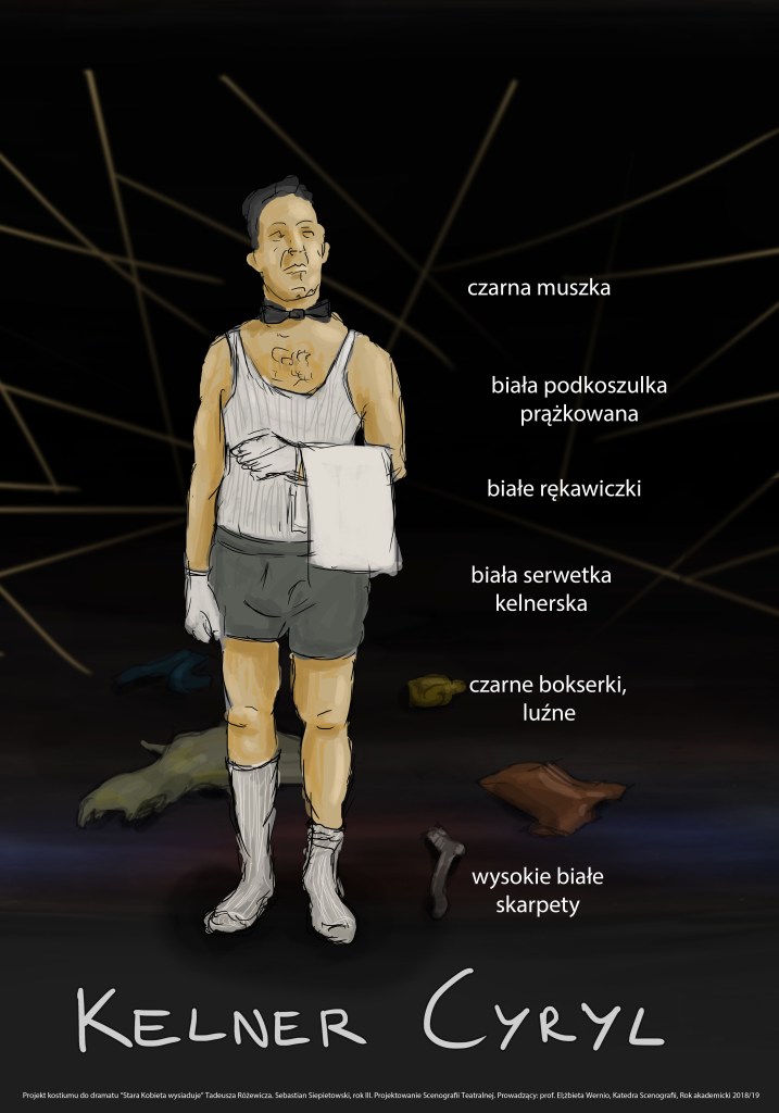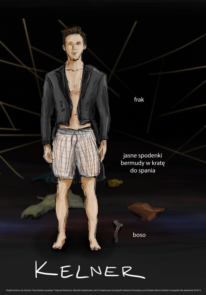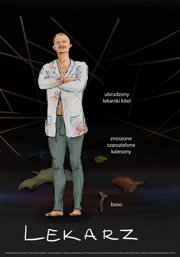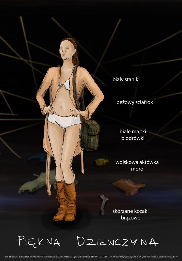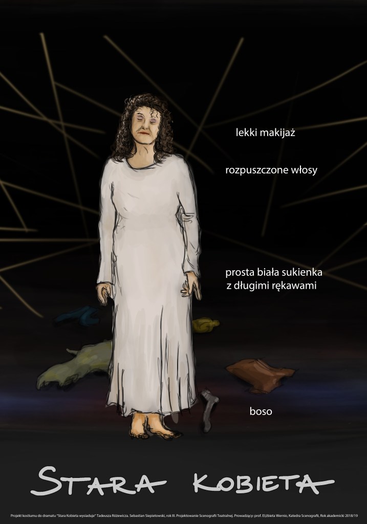 Projekty scenografii i kostiumów do dramatu „Stara Kobieta Wysiaduje” Różewicza